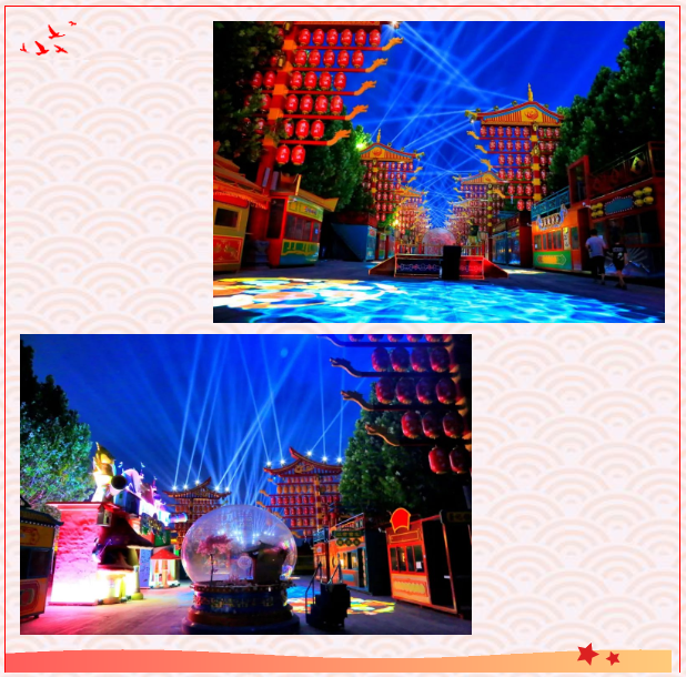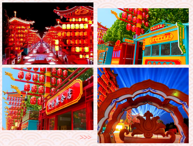 街区设施分别包括:牌楼3座;灯牌12个;灯杆42根;儿童游乐设施14种;美陈打卡5种;互动设施、行为艺术及大小舞台23个;演绎节目:全天120多场。同时结合城市历史特色、民俗特色、百年老字号、非遗传承等,将典型文化进行点-线-面的逐级式分布构建,打造点亮京津冀文旅产业新标杆!