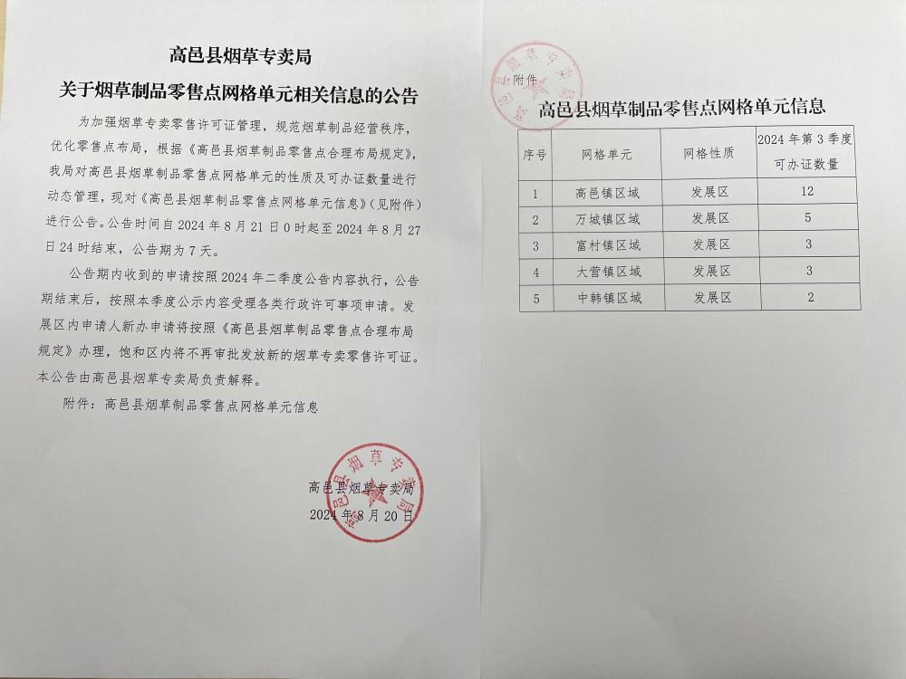 高邑县烟草专卖局关于烟草制品零售点网格单元相关信息的公告(2024年第三季度)