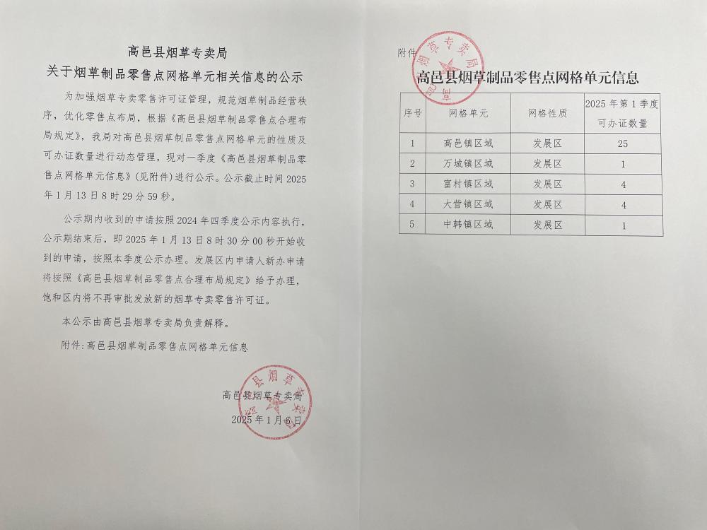 高邑县烟草专卖局关于烟草制品零售点网格单元相关信息的公示