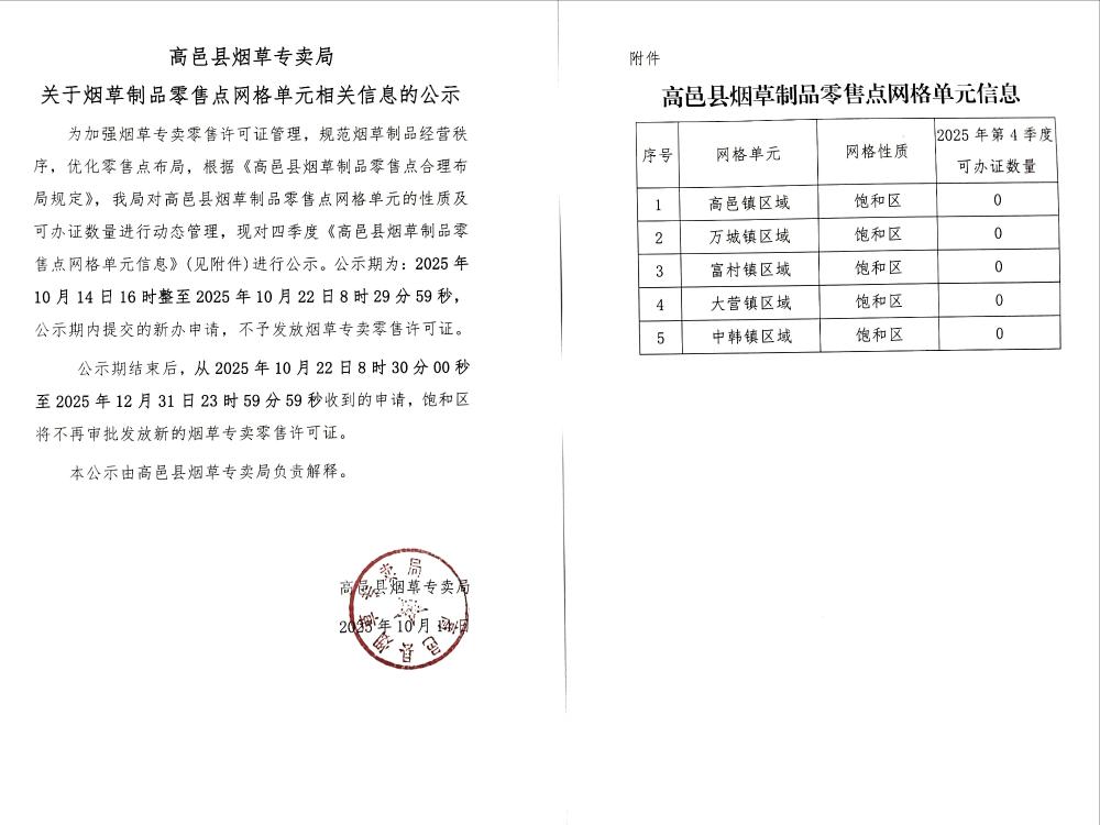 高邑县烟草专卖局关于烟草制品零售点网格单元相关信息的公示