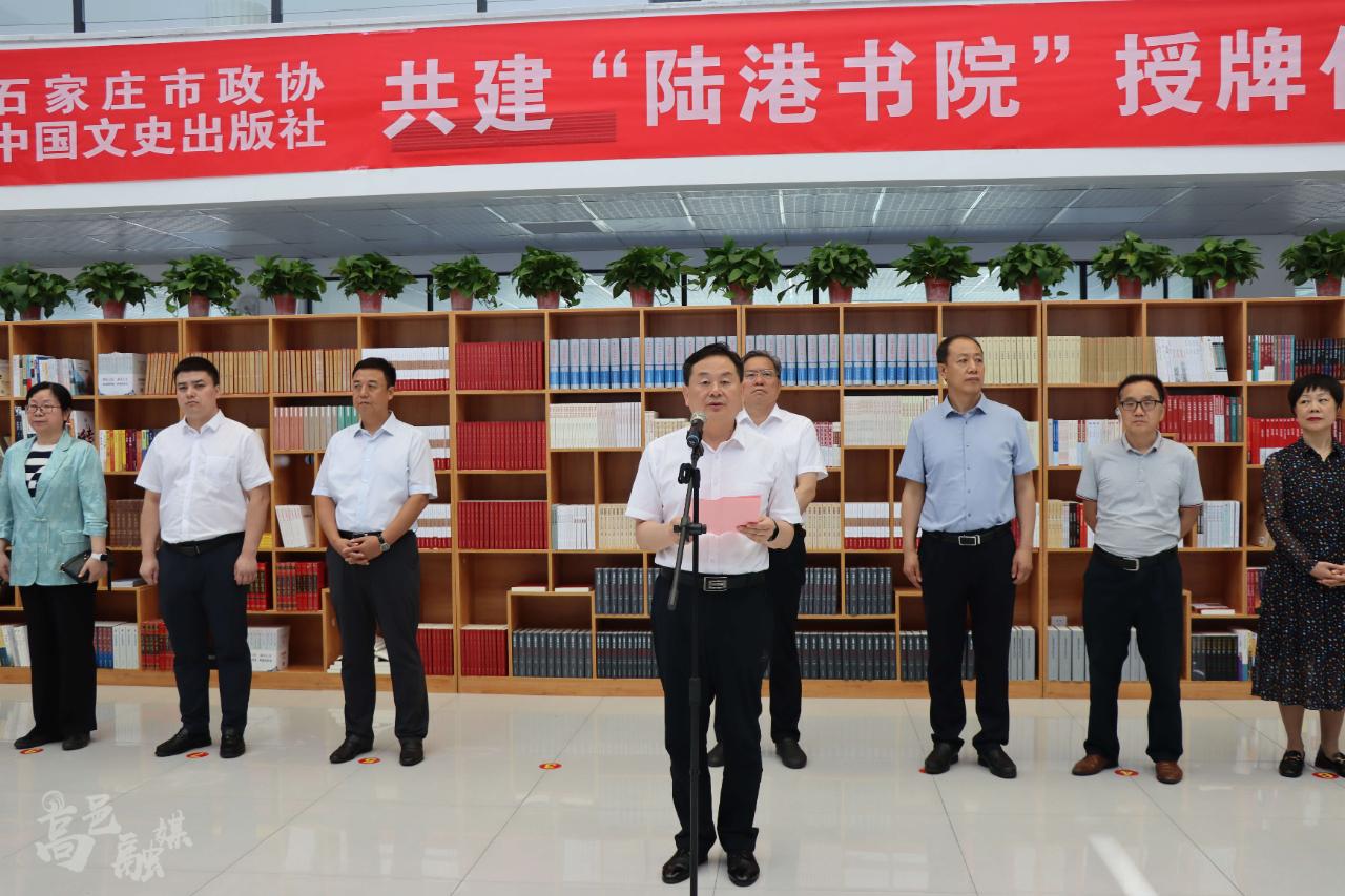 县委书记李玉涛向中国文史出版社和省市政协长期以来对陆港建设的关心支持表示衷心的感谢!向“陆港书院”的正式揭牌成立表示热烈的祝贺!他指出,近年来,高邑县牢固树立“强陆港、兴高邑”发展思路,大力发展枢纽经济、通道经济、口岸经济、临港经济,通道→物流→贸易→产业的全链条发展格局正在加速形成,正在成为全省乃至京津冀地区对外开放的“桥头堡”和“新高地”。希望“陆港书院”致力于传承和弘扬高邑陆港精神,通过植根脉、凝共识、赋动能,进一步扩大石家庄国际陆港文化品牌的影响力,为群众了解陆港、走进陆港搭建桥梁、提供平台。希望各级政协组织充分发挥群英荟萃、智力密集、联系广泛的独特优势,为石家庄国际陆港的发展加油助力、蓄势赋能。此次捐赠仪式充分彰显了文史出版社的使命情怀,更加丰富了国际陆港的文化内涵。希望各位领导一如既往地关心高邑、支持高邑、推介高邑,多来高邑走一走、看一看,给予高邑经济发展更多指导和助力。