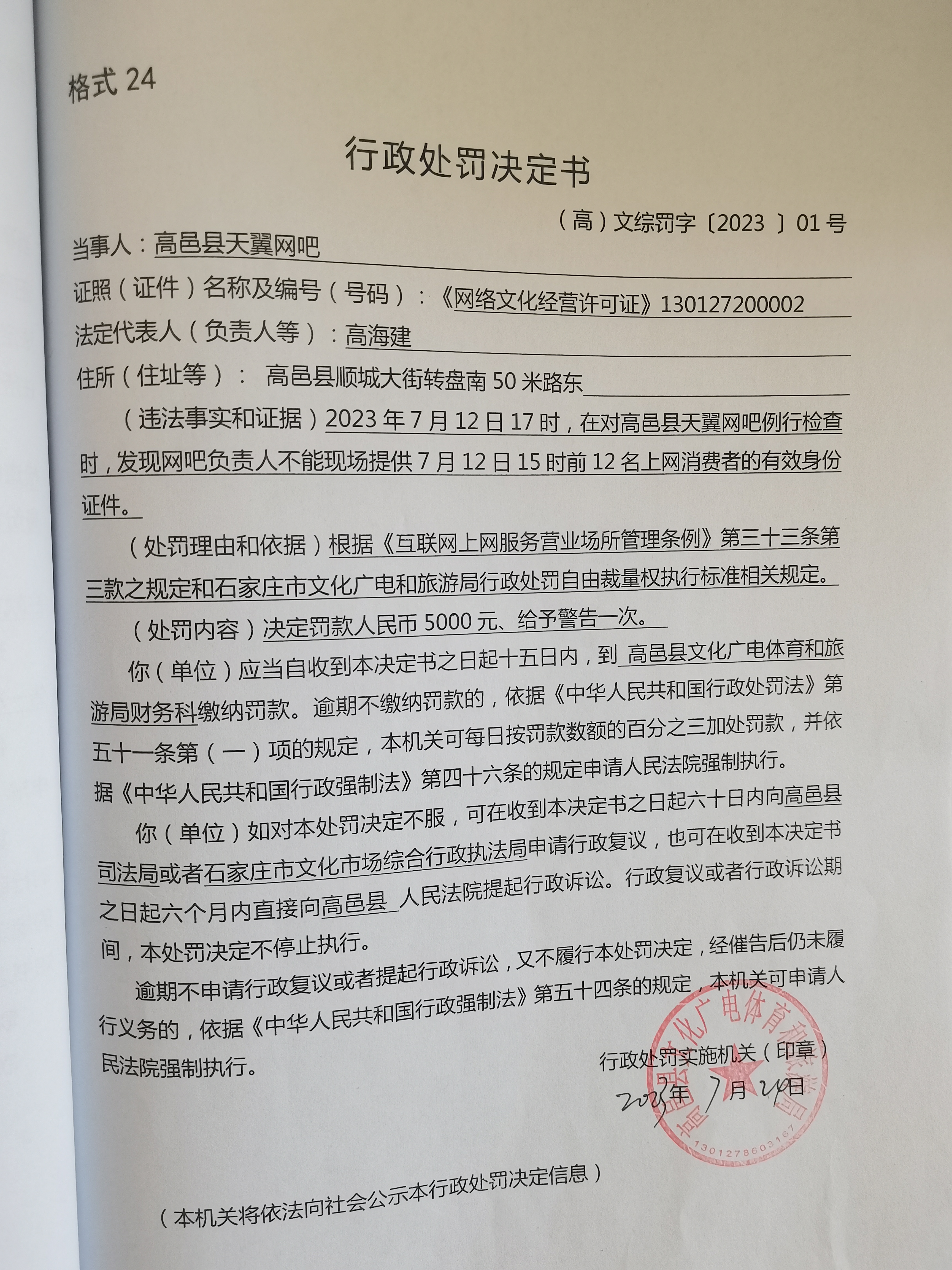 高邑县文化广电体育和旅游局对高邑县天翼网吧行政处罚决定书的公示