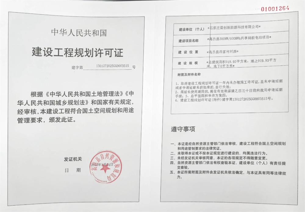 高邑县300MW/600MWh共享储能电站项目建设工程规划许可