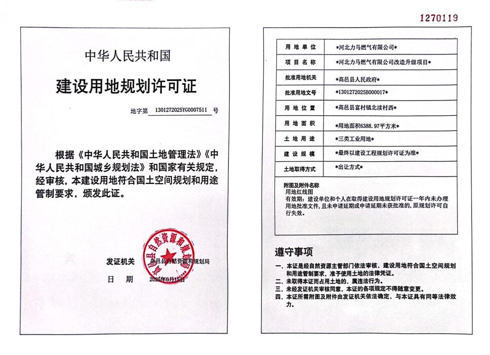 河北力马燃气有限公司改造升级项目建设用地规划许可证
