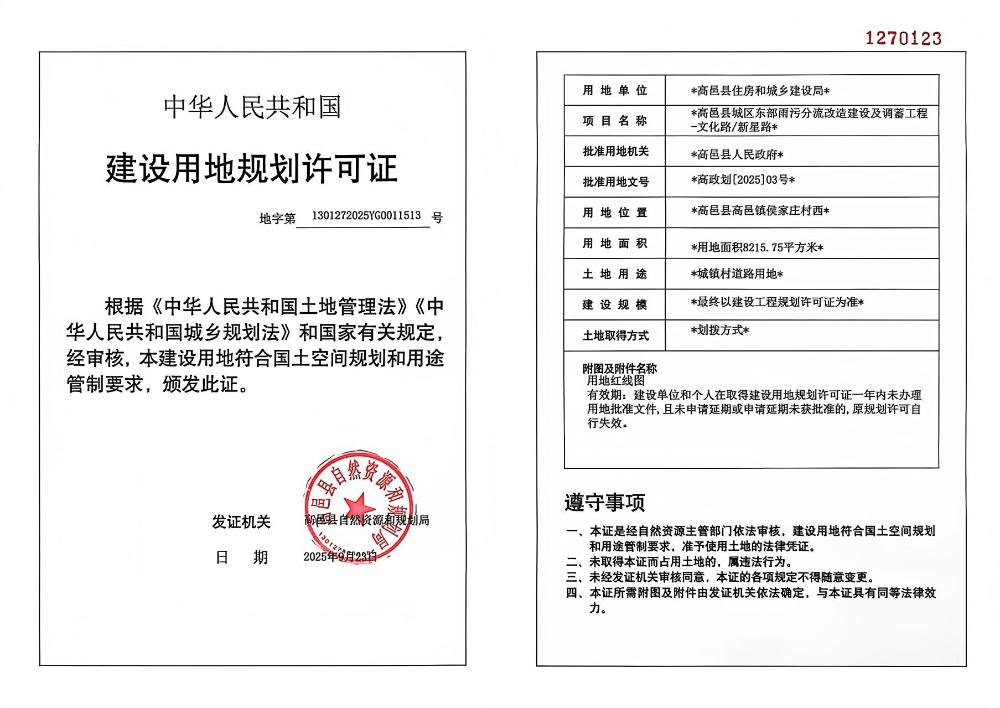 高邑县城区东部雨污分流改造建设及调蓄工程-文化路/新星路建设用地规划许可