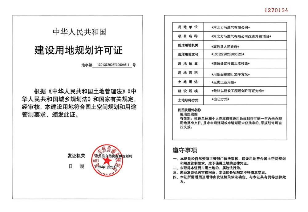 河北力马燃气有限公司改造升级项目建设用地规划许可证
