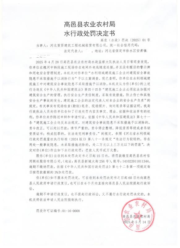 高邑县农业农村局水行政处罚决定书高农(水政)罚决【2025】01号