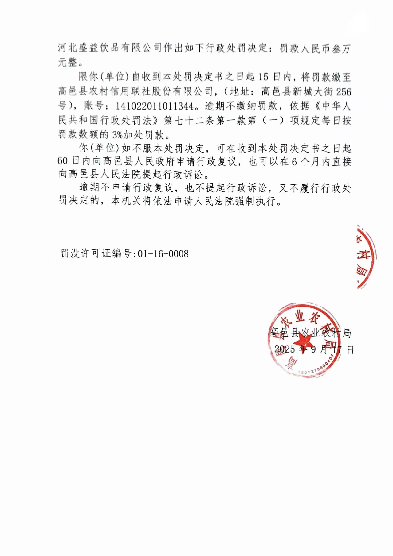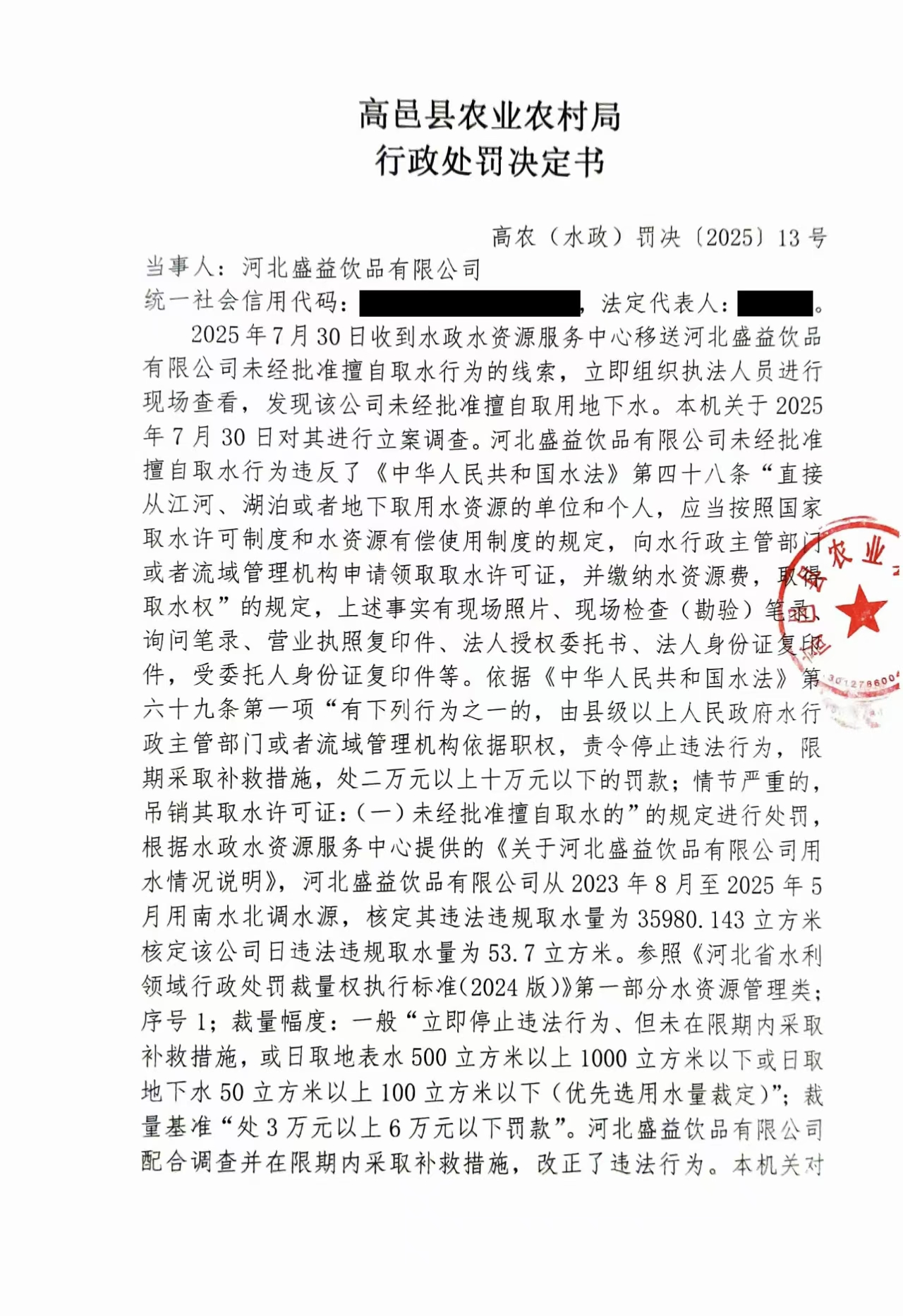 高邑县农业农村局行政处罚决定书高农(水政)罚决〔2025〕13号