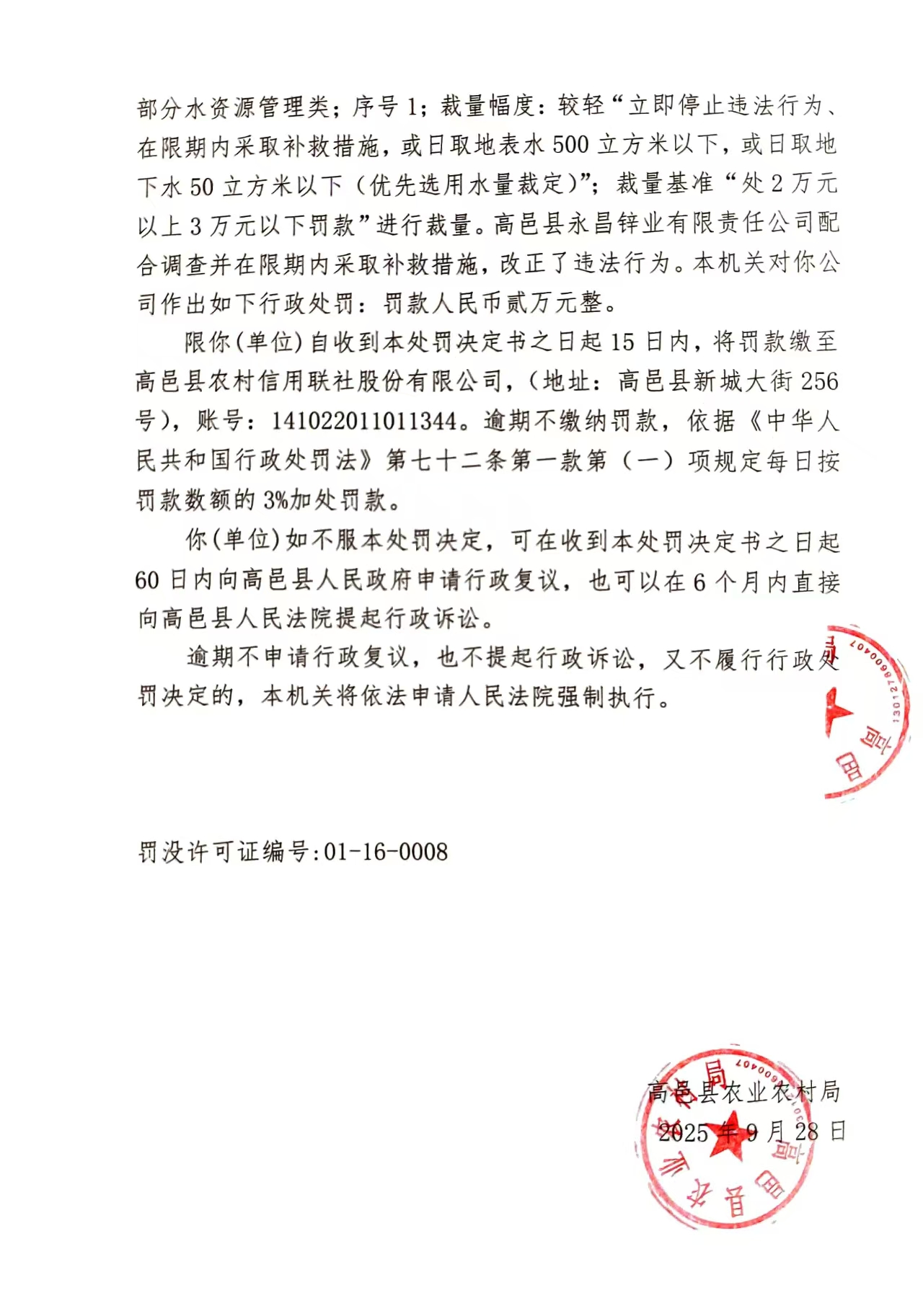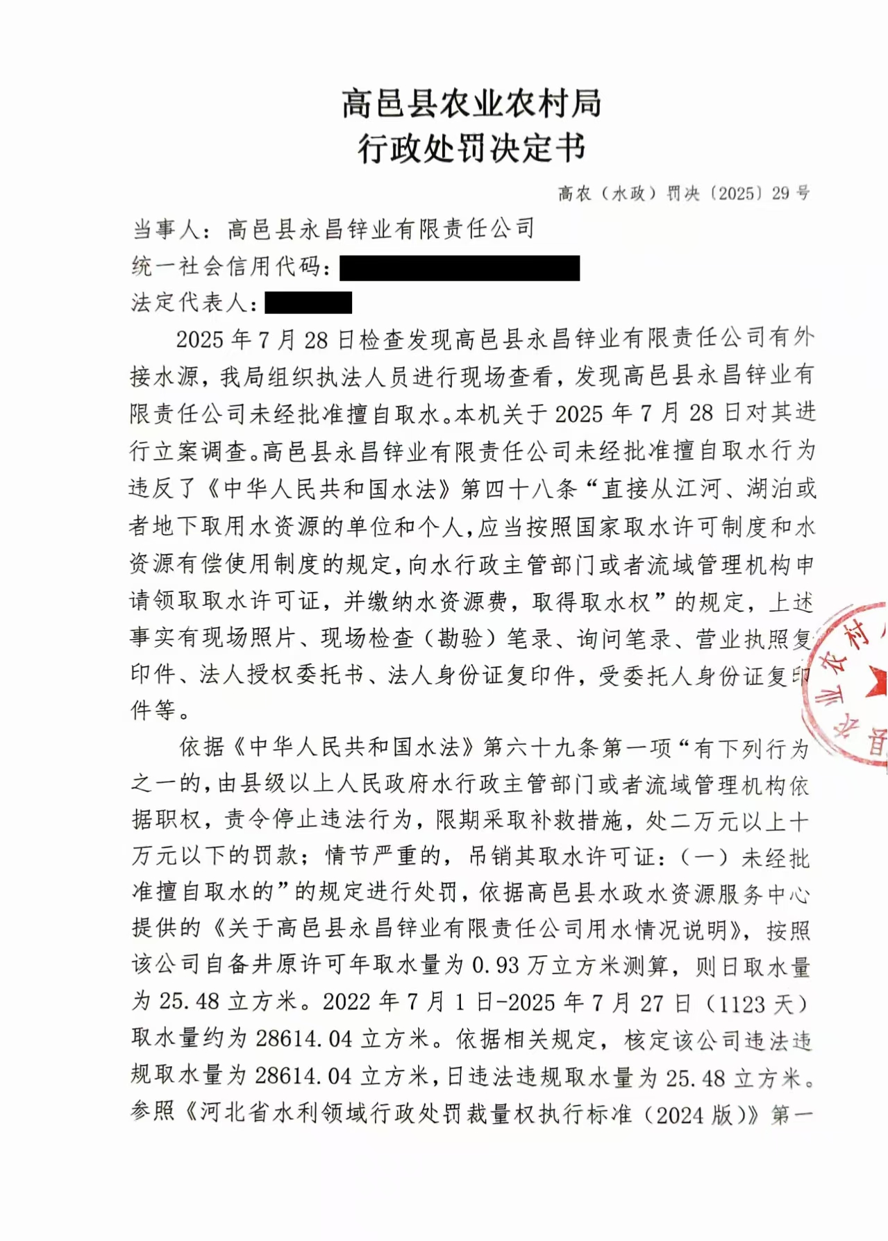 高邑县农业农村局行政处罚决定书高农(水政)罚决〔2025〕29号