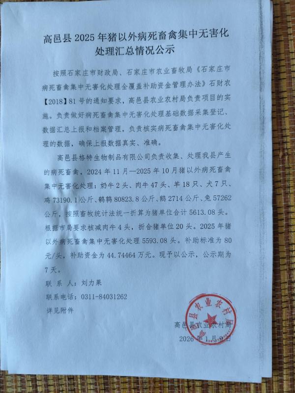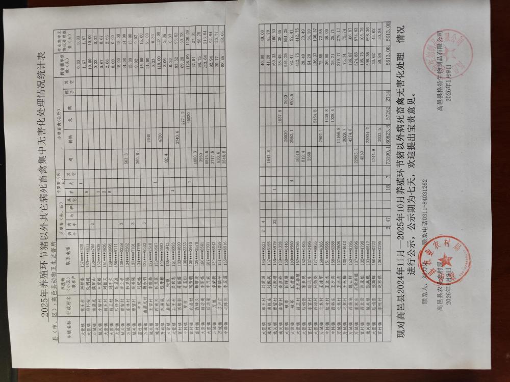 高邑县2025年猪以外病死畜禽集中无害化处理汇总情况公示
