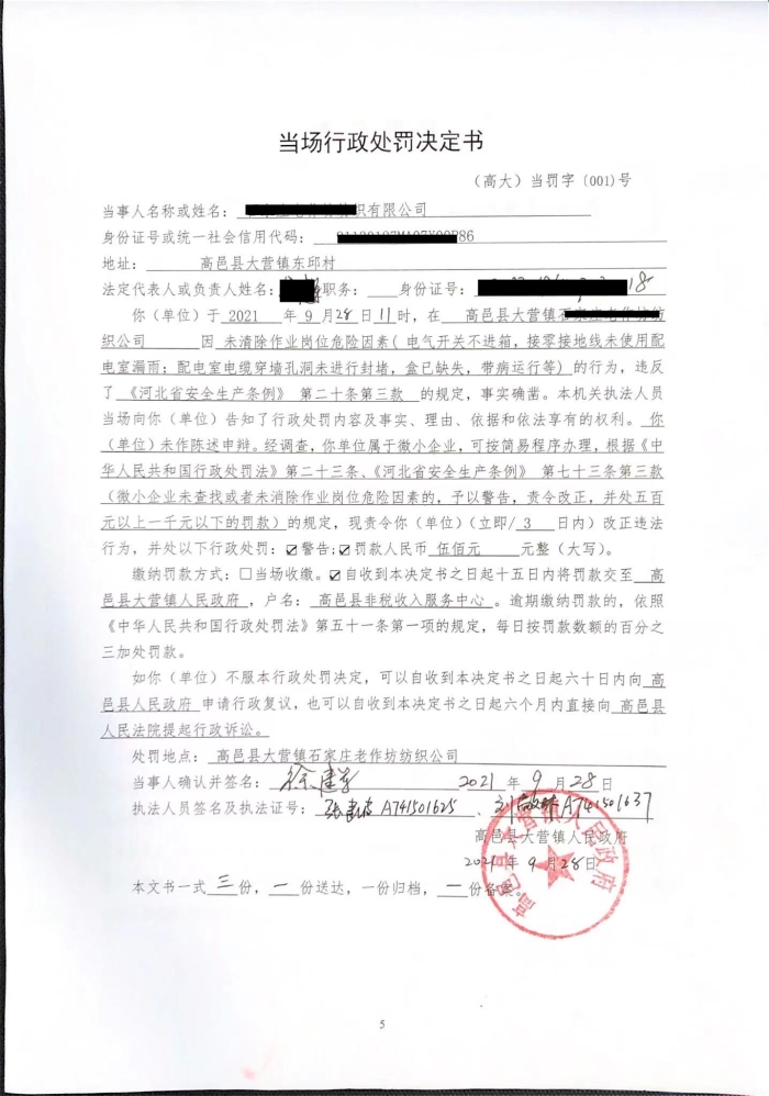 大营镇对老作坊纺织有限公司行政处罚决定书公示