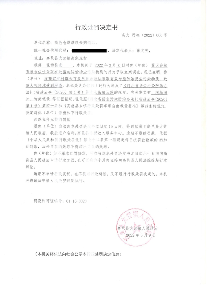 大营镇对仓满满粮食购销站的行政处罚
