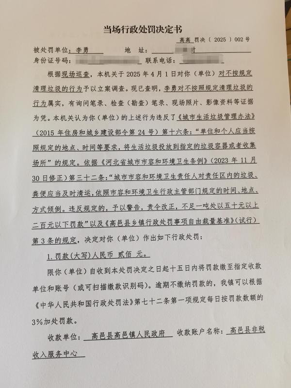 高邑镇对李勇的行政处罚决定书的公示