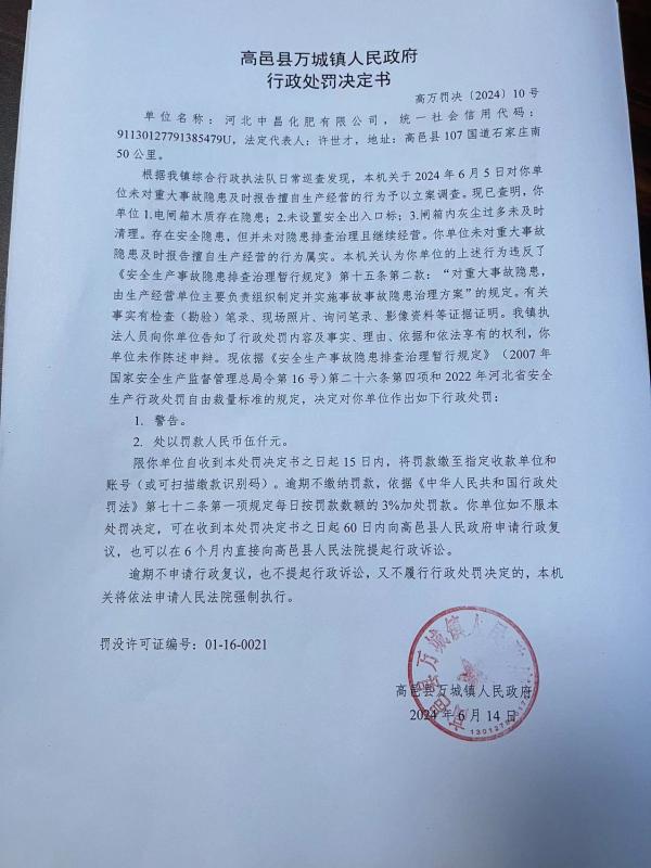 万城镇对河北中昌化肥有限公司的行政处罚决定书的公示