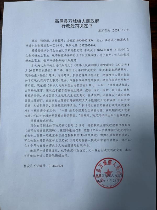 万城镇对张晓鹏的行政处罚决定书的公示