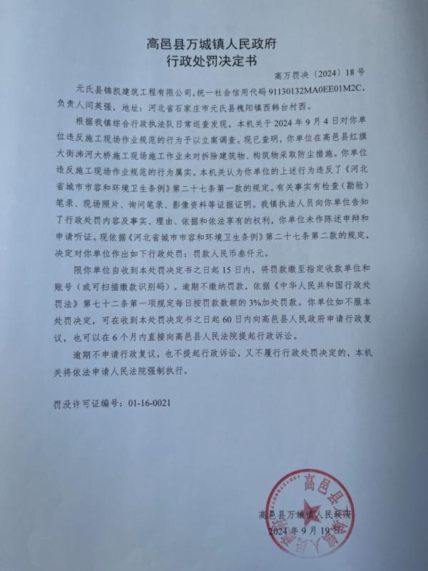 万城镇对元氏县锦凯建筑工程有限公司的行政处罚决定书的公示