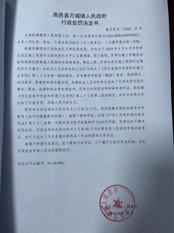 万城镇对天津恒锦建筑工程有限公司的行政处罚决定书的公示