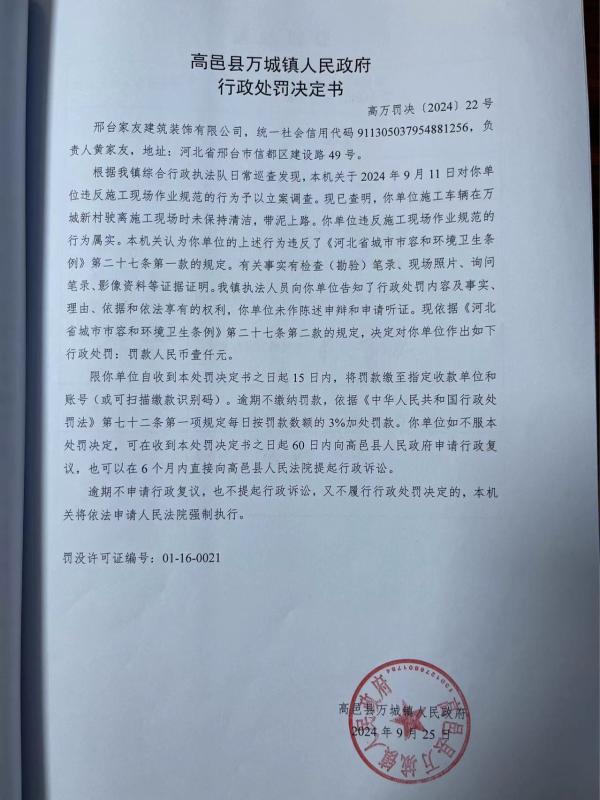 万城镇对邢台家友建筑装饰有限公司的行政处罚决定书的公示