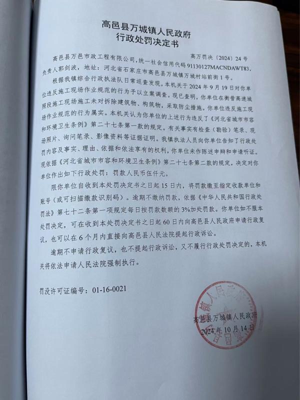 万城镇对高邑县万邑市政工程有限公司的行政处罚决定书的公示