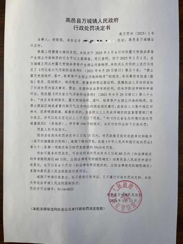 万城镇对胡聚强露天焚烧杂草等产生烟尘污染物质的行政处罚决定书的公示