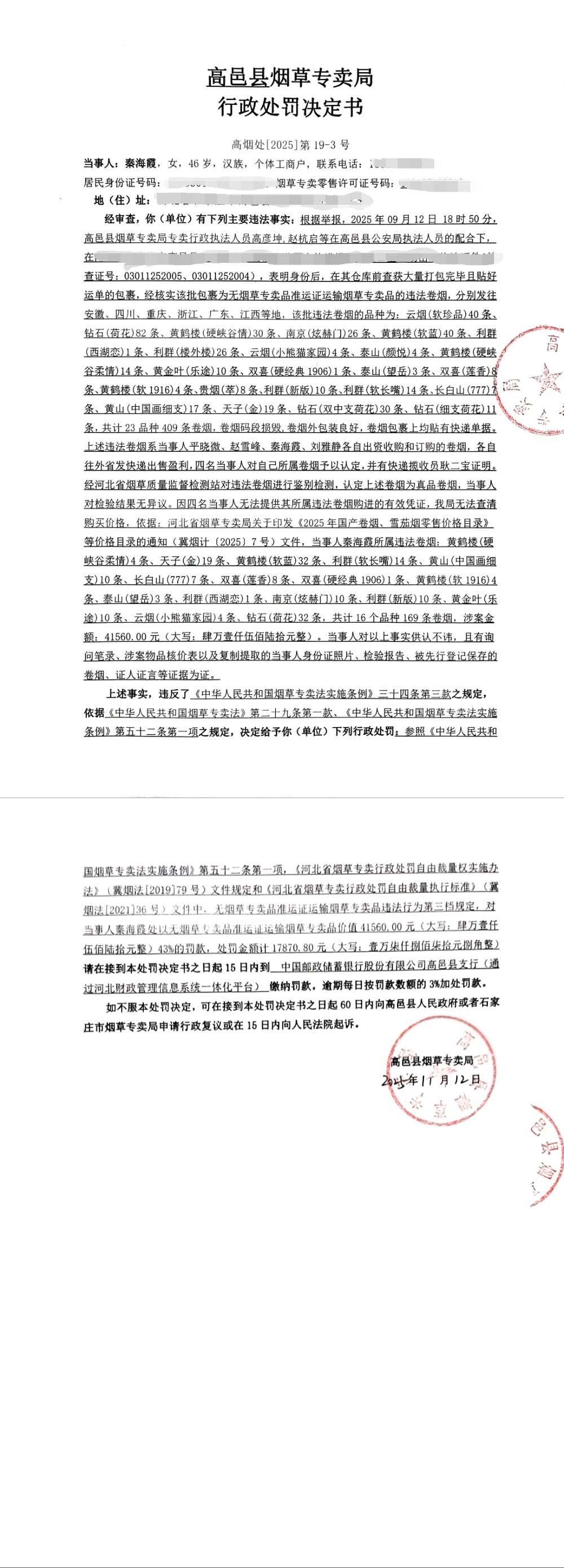 秦海霞行政处罚决定书
