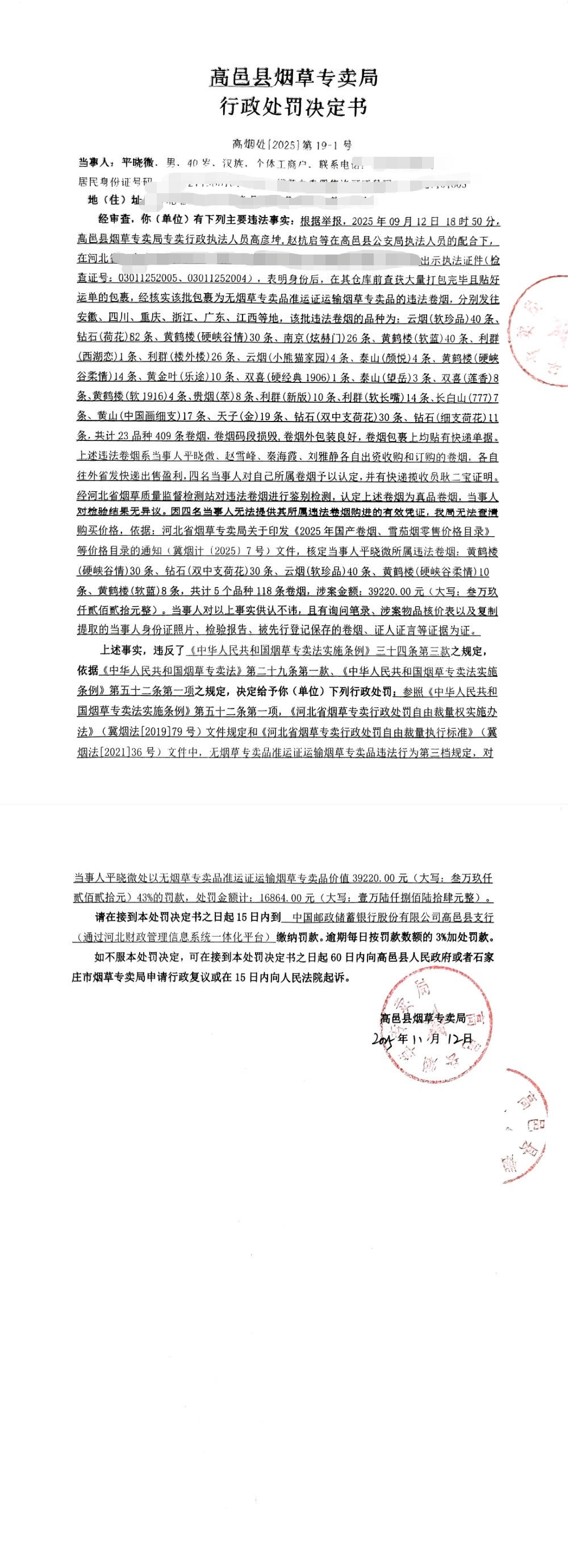 平晓薇行政处罚决定书