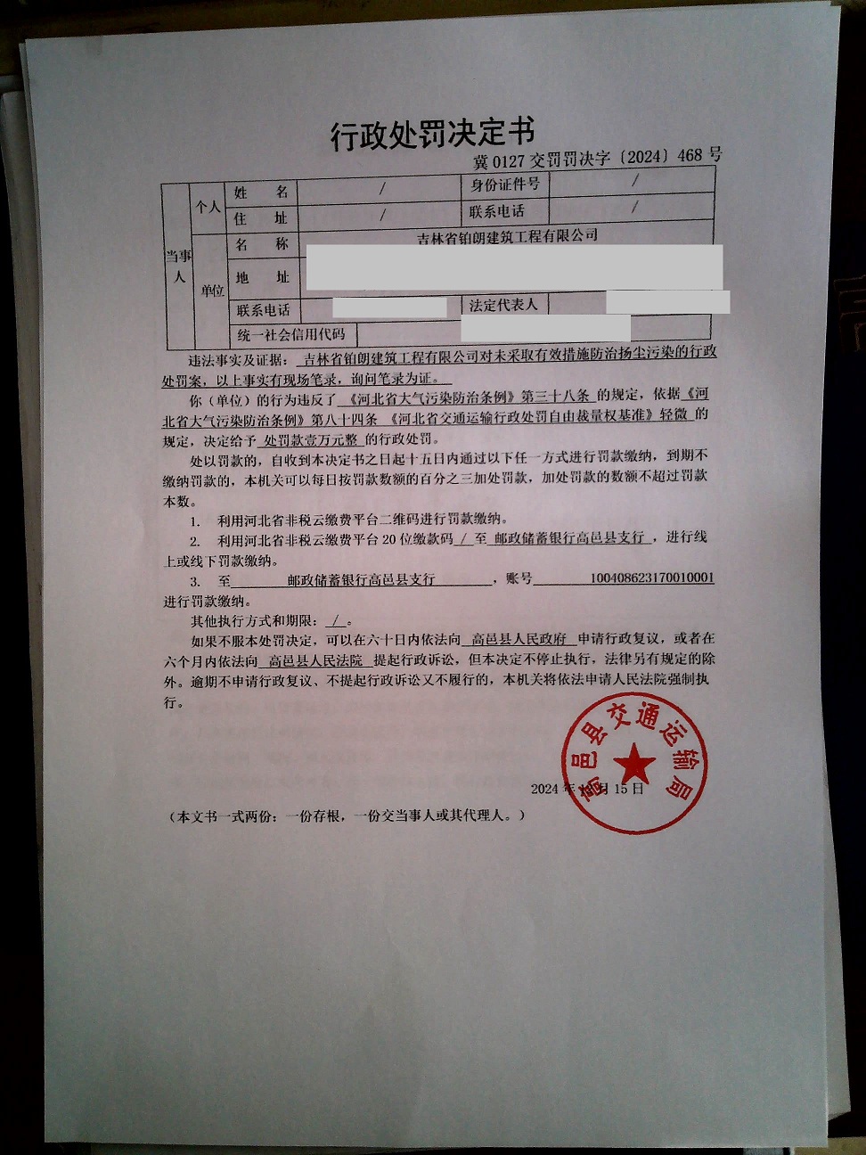 高邑县交通运输局 吉林省铂朗建筑工程有限公司对未采取有效措施防治扬尘污染的行政处罚案