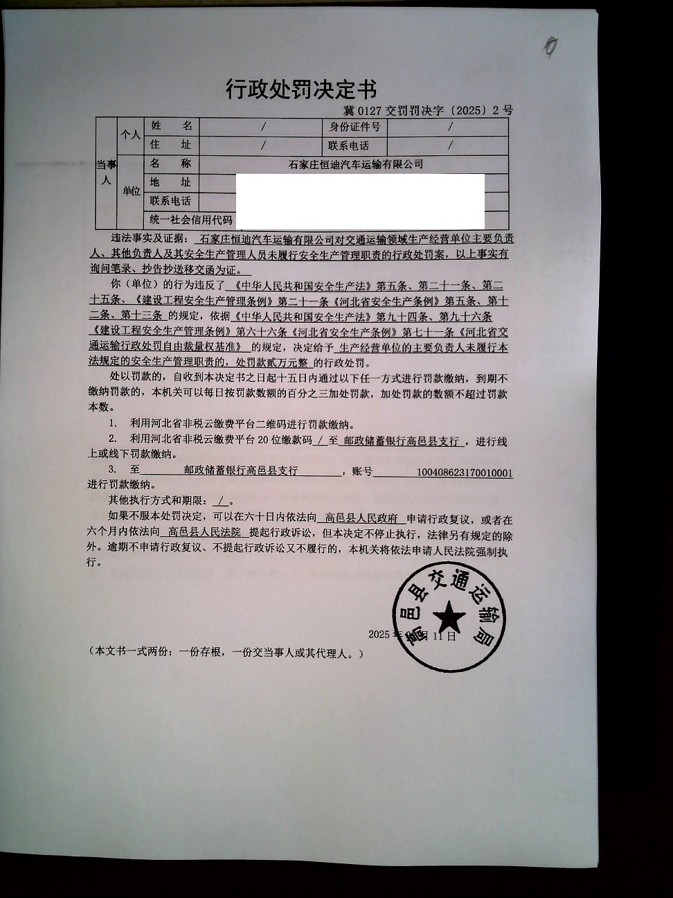 高邑县交通运输局 石家庄恒迪汽车运输有限公司对交通运输领域生产经营单位主要负责人、其他负责人及其安全生产管理人员未履行安全生产管理职责的行政处罚案