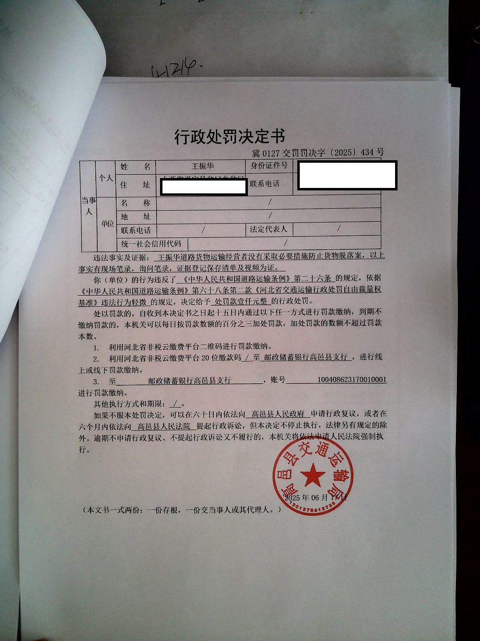 高邑县交通运输局 王振华道路货物运输经营者没有采取必要措施防止货物脱落案
