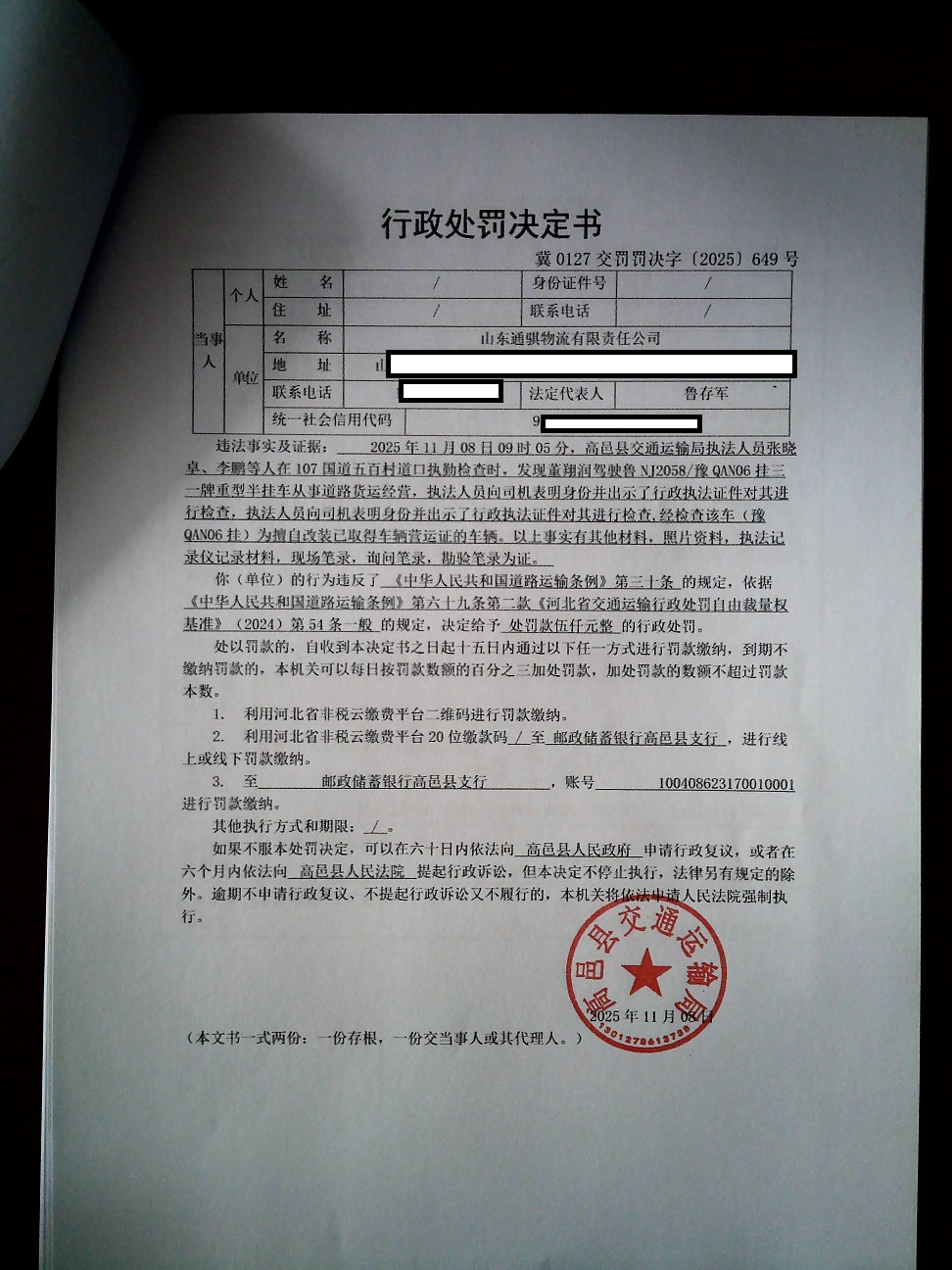 高邑县交通运输局 山东通骐物流有限责任公司擅自改装已取得车辆营运证的车辆的案