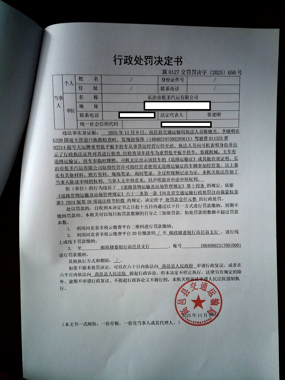 高邑县交通运输局 长治市乾圣汽运有限公司取得经营许可的经营者使用无道路运输证的车辆参加经营案