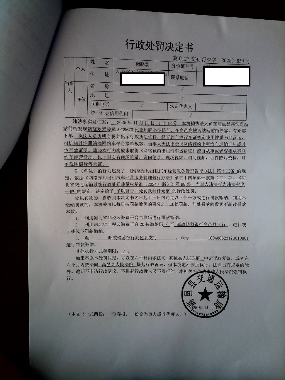 高邑县交通运输局 籍晓欢未取得《网络预约出租汽车运输证》擅自从事或者变相从事网约车经营活动行为案