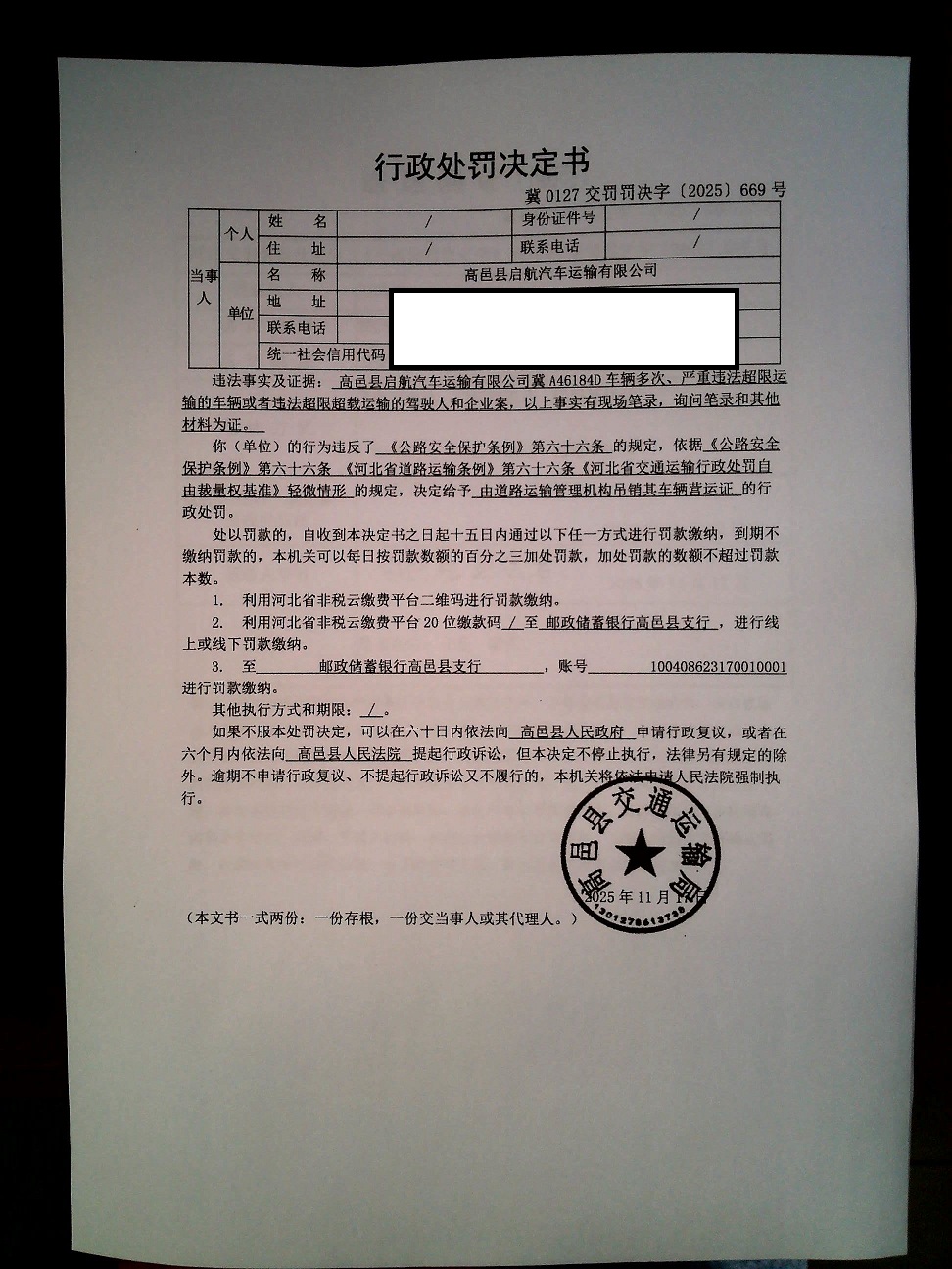 高邑县交通运输局 高邑县启航汽车运输有限公司冀A46184D货车多次、严重违法超限运输的车辆或者违法超限超载运输的驾驶人和企业案