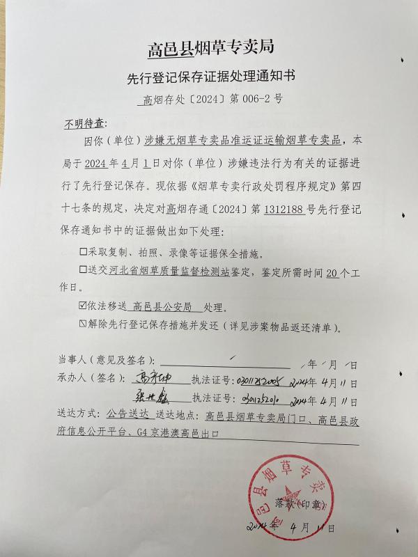 先行登记保存证据处理通知书(高烟存通【2024】第006-2号)