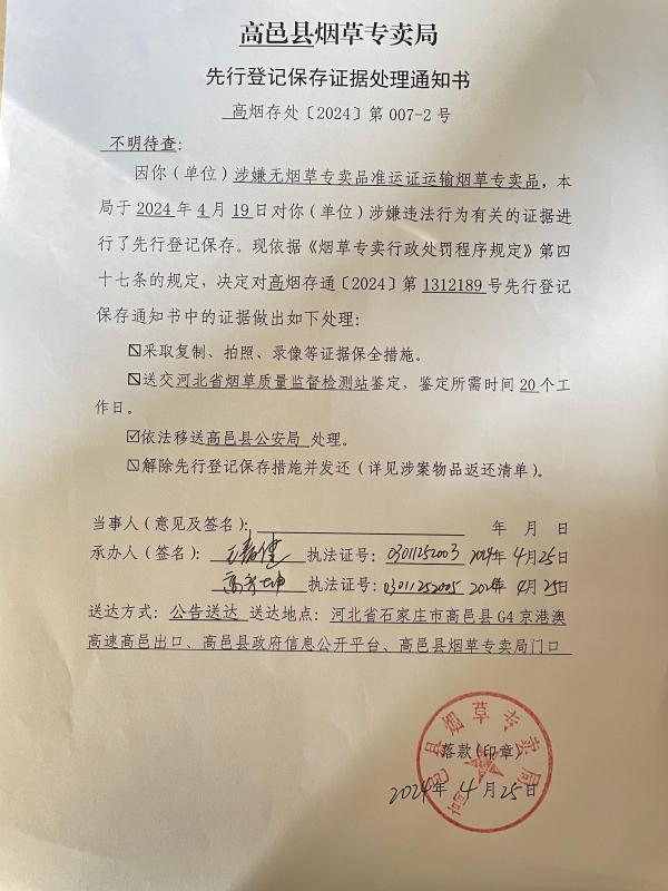 先行登记保存证据处理通知书(高烟存通【2024】第007-2号)