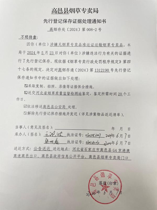 先行登记保存证据处理通知书(高烟存通【2024】第008-2号)