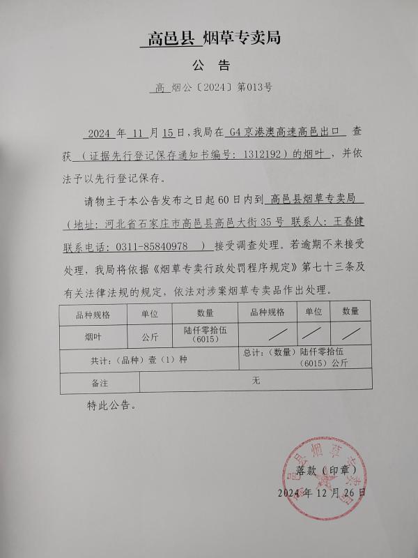 高邑县烟草专卖局公告(2024年12月26日寻找当事人)