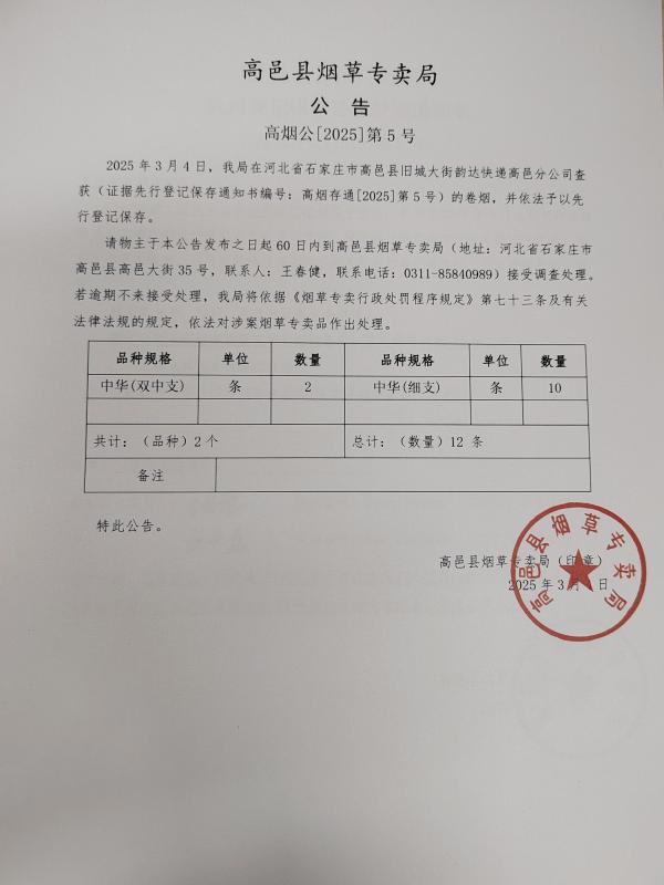 高邑县烟草专卖局公告(2025年3月4日寻找当事人)