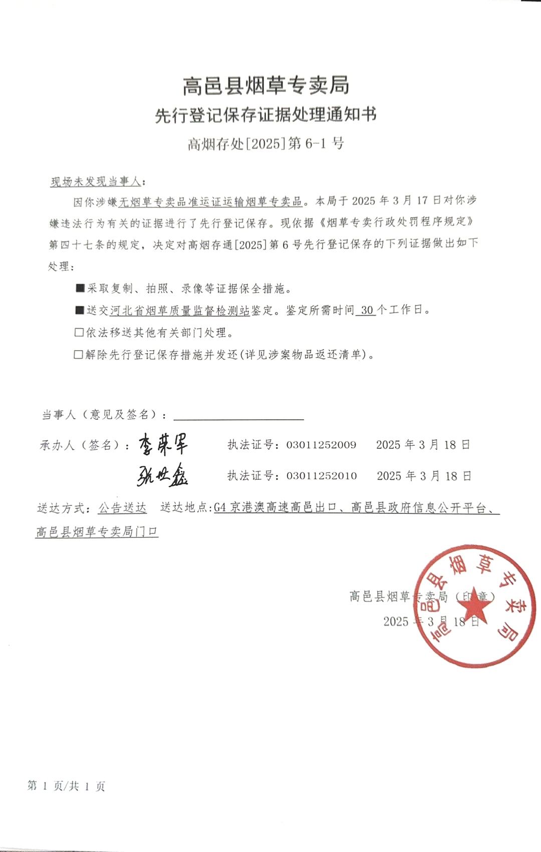 高邑县烟草专卖局先行登记保存证据处理通知书(高烟存处【2025】第6-1号)