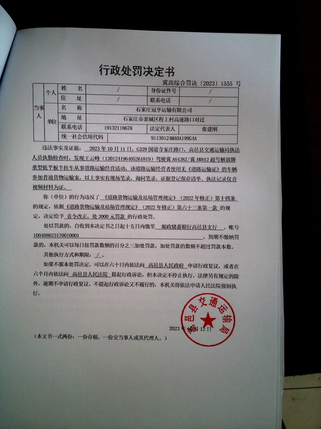 高邑县交通运输局 石家庄冠亨运输有限公司使用无《道路运输证》的车辆参加普通货物运输案