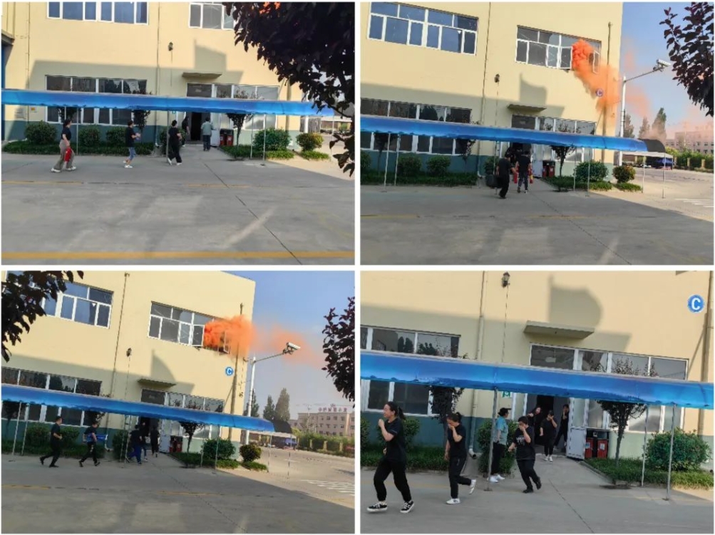 演练以生产二车间出现火情为背景。不一会,随着火灾警报器被拉响,安全演练活动正式开始。30余名一线职工按照逃生技巧到达指定安全区域,由警戒疏散组对火灾区域进行封锁,抢险救灾组使用干粉灭火器进行实战灭火演练,三个人一字形手提干粉灭火器进行初起火灾的灭火扑救,随后医疗救护组对现场受伤人员开展紧急救治工作。企业负责人立刻向应急局上报火灾情况,拨打119、120。消防大队赶到现场,对现场情况进行了解,然后立刻展开救援,各小组按方案进行演练,整个过程有条不紊,取得了预期效果。
