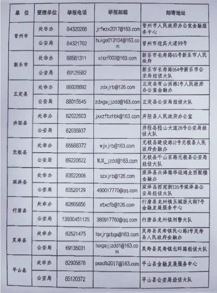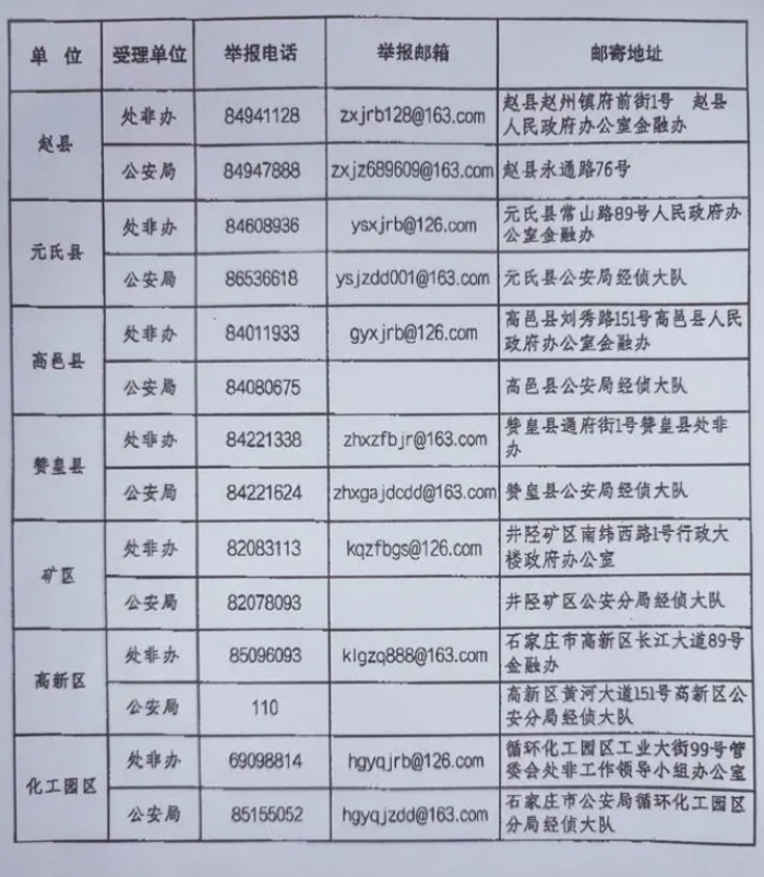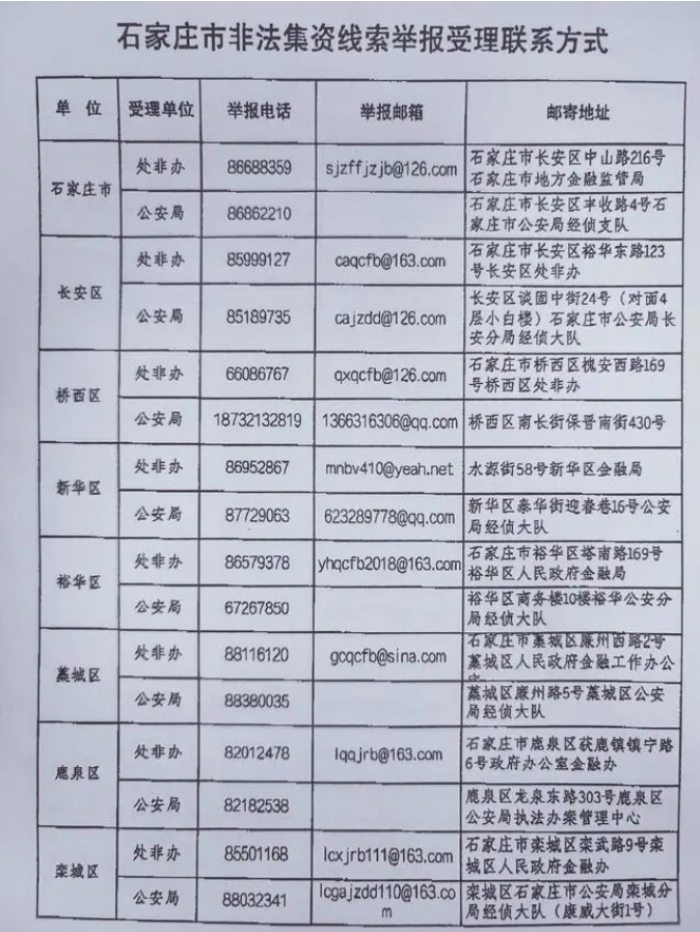 欢迎社会各界和广大干部群众积极主动举报非法集资线索,所提供的线索一经查实,依据《石家庄市非法集资奖励举报办法》给予举报人相应奖励,最高可获得人民币20万元。同时,我们将对举报人的个人信息和举报内容严格保密,依法保护举报人的合法权益。