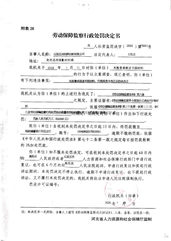 高邑县人力资源和社会保障局对石家庄市润恒祥纺织有限公司未报送书面材料案的行政处罚决定书