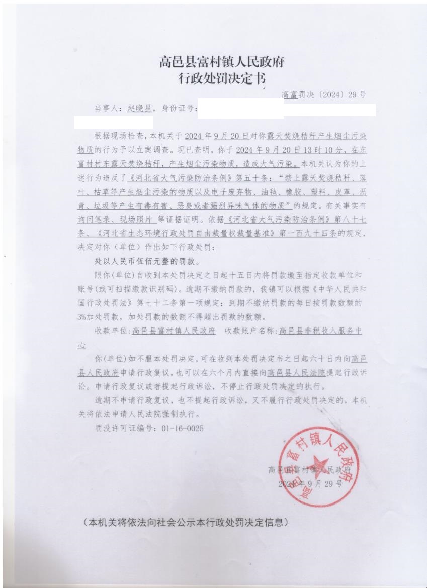 富村镇对赵晓星行政处罚决定书的公示