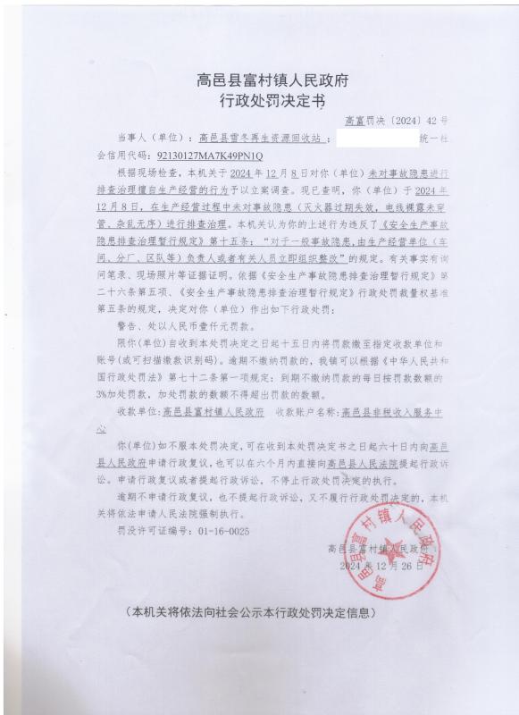 富村镇对高邑县雪冬再生资源回收站行政处罚决定书的公示